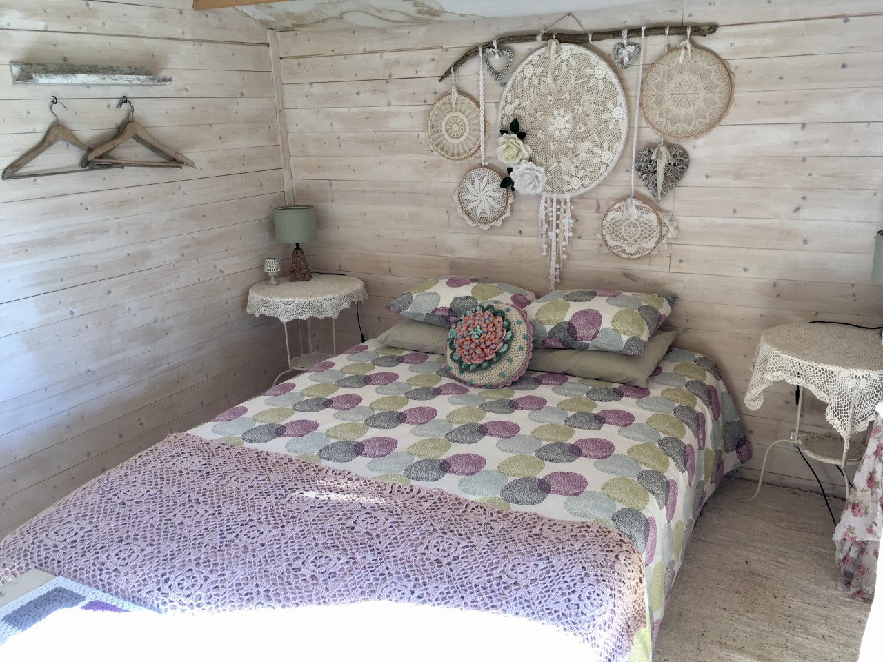 There is a comfortable double bed and a seating area inside. The atmophere is very romantic and serene through the use of soft pastels and whites and, like in all of our accommodations, you´ll be surrounded by lots of handmade decorations.