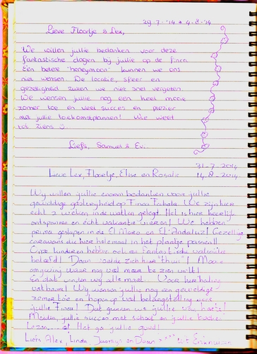 Finca FahalaCasa RuralGastenboekBekijk de leuke reacties van de gasten die je voor zijn geweest in het gastenboek. Als je bij ons te gast bent geweest en geen kans hebt gezien om er iets in te schrijven, niet getreurd, mail het ons en we plaatsen het alsnog op deze pagina. email: contact@fincafahala.nl Tel: 0034659270979 © Moonshoes |